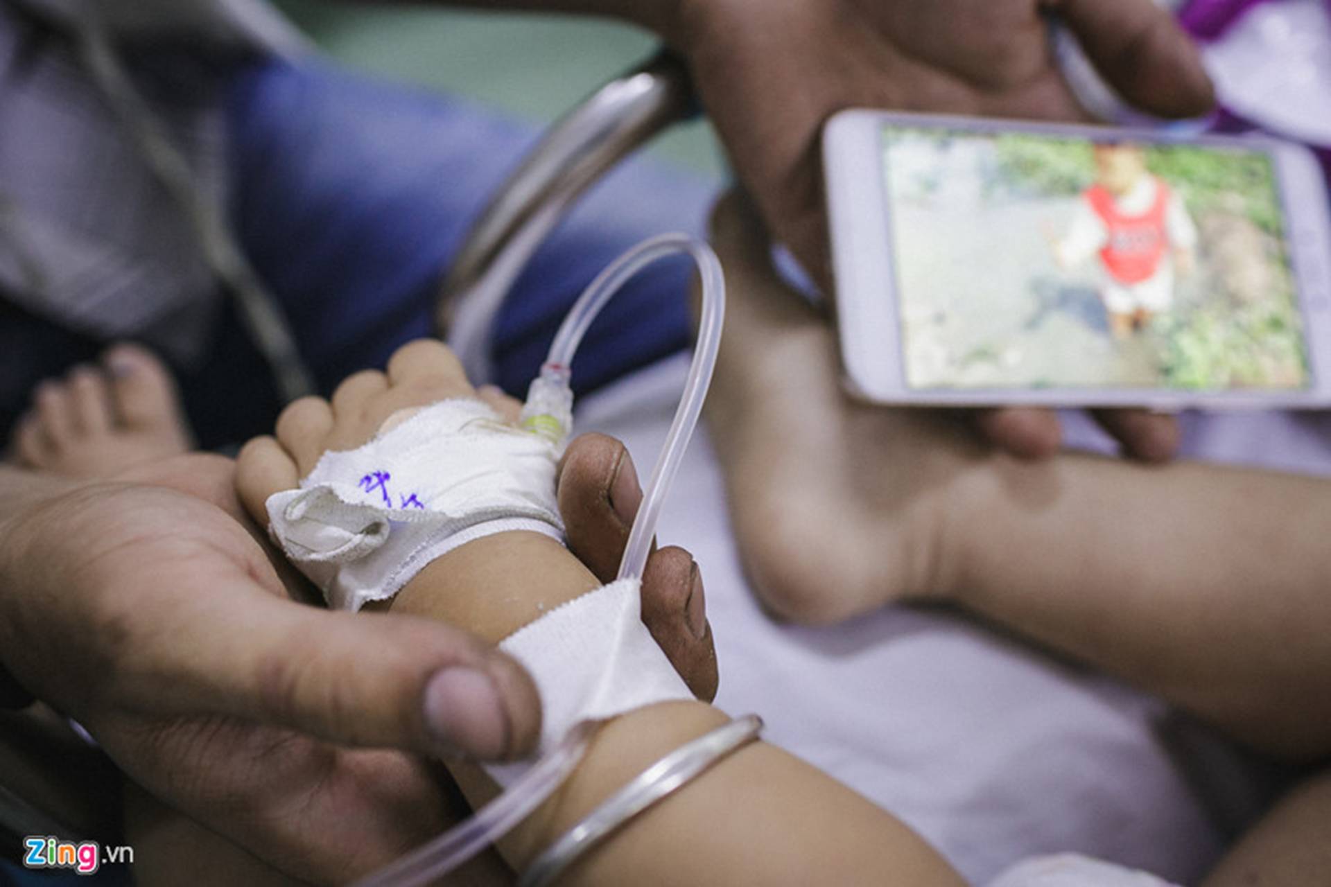 "Thấy bạn của nó bị trước rồi, nhưng không ngờ cũng tới lúc con mình bị luôn", người phụ nữ nức nở khi gọi điện thoại về cho gia đình báo con trai bị mắc bệnh tay chân miệng. Các em nằm điều trị tại bệnh viện phải bị trói tay, chân lại để phòng các biến chứng co giật, hoặc ngăn không cho các em lăn khỏi giường bệnh.