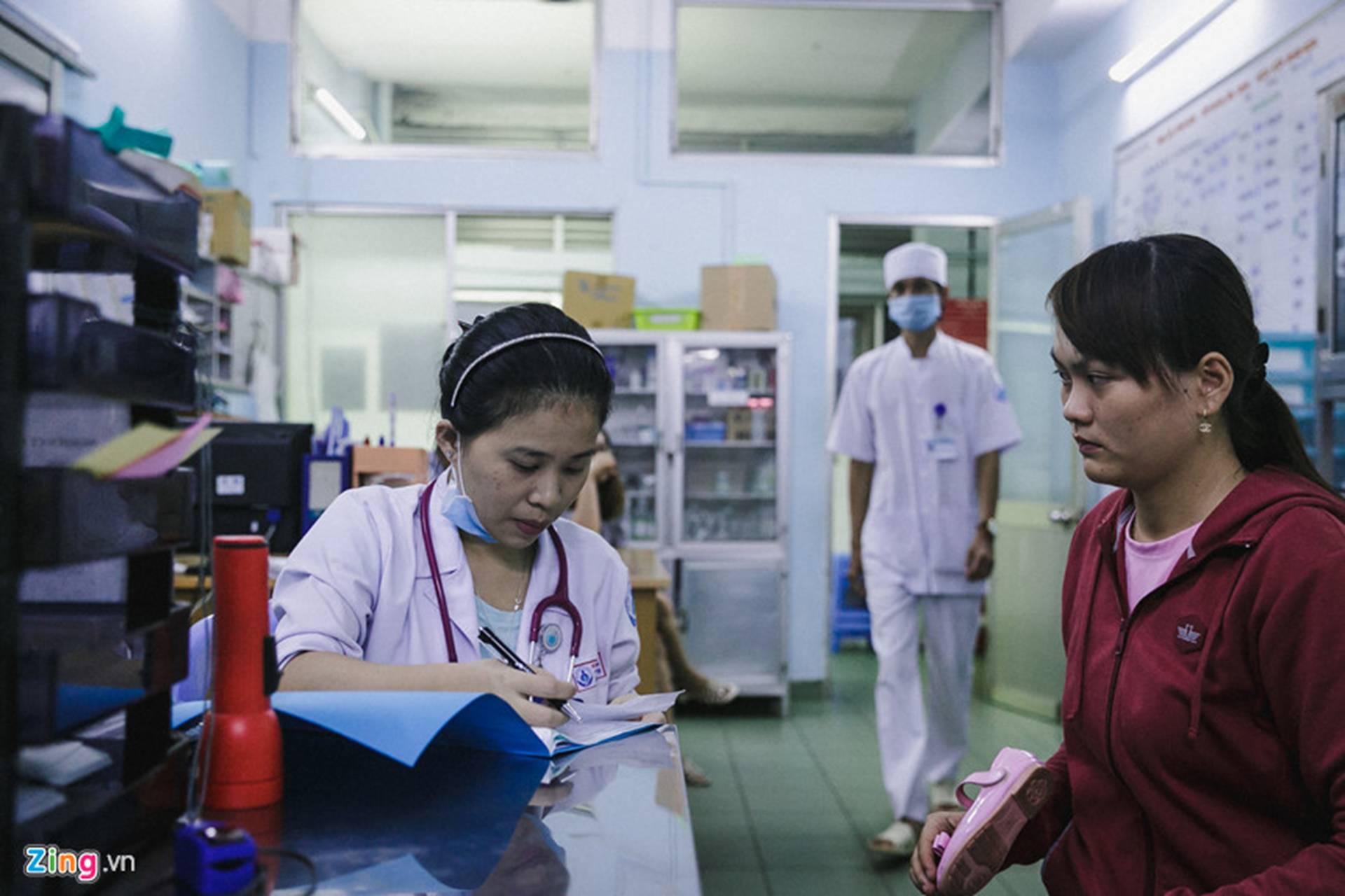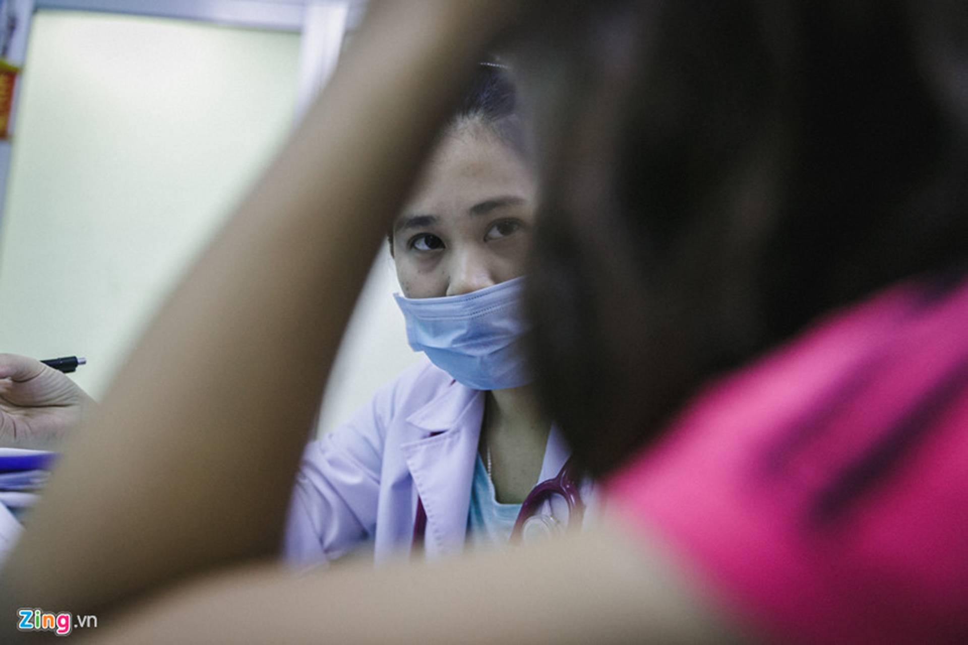 Đồng hồ điểm 0h, kíp trực của bác sĩ Phạm Ngọc Tường Vi vẫn làm việc căng thẳng, chen chúc trong căn phòng chật hẹp với hàng trăm bệnh nhi đang xếp hàng chờ khám và cấp cứu. May thay, ca trực đêm nay có thêm 4 sinh viên y khoa thực tập hỗ trợ khám, sàng lọc, phân loại đã phần nào chia lửa với các bác sĩ. Người khám, người hỏi, người viết, người đánh máy,… tất cả phối hợp nhịp nhàng như một hệ thống. Chẳng ai kịp nói, kịp ăn một bữa đầy đủ, không khí càng về đêm càng thêm căng thẳng.