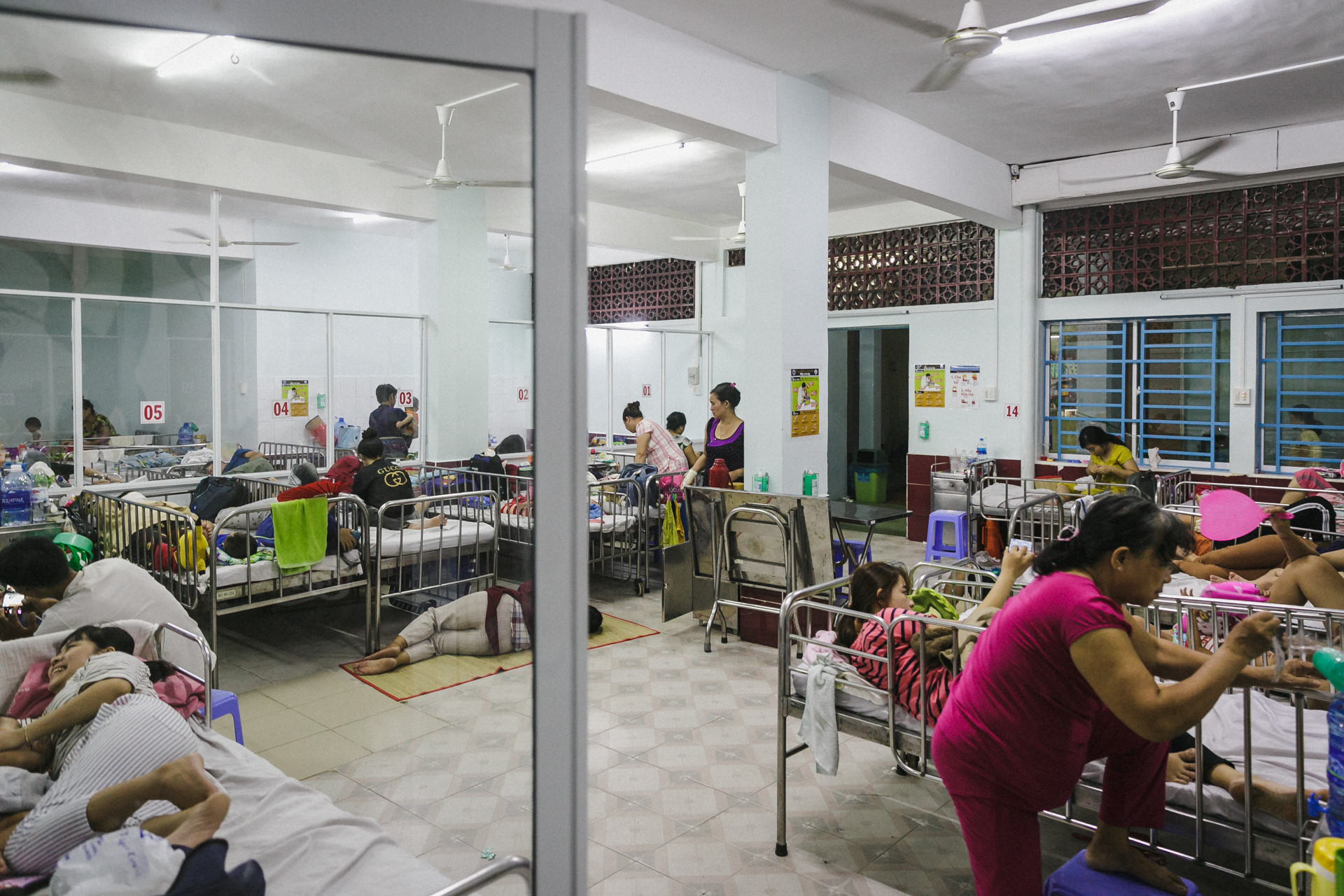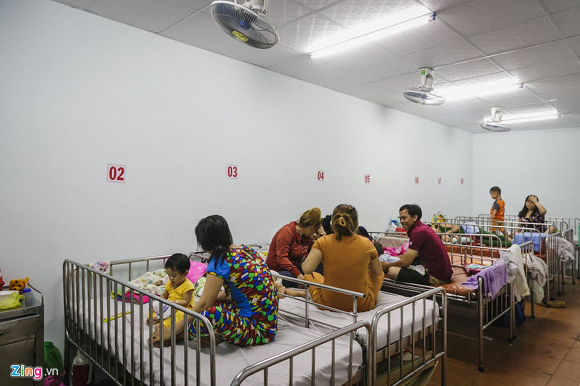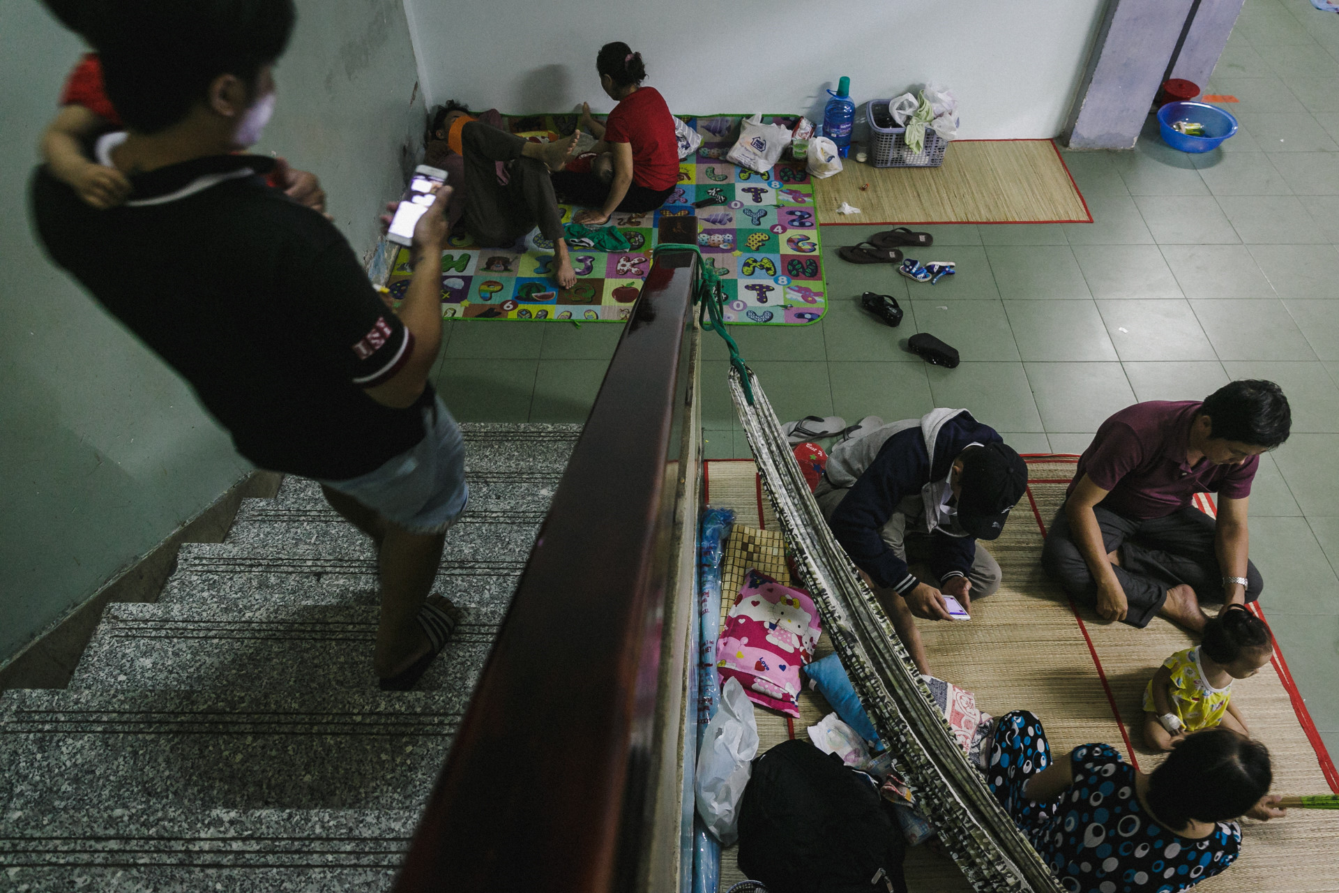 Nhiều người không chịu nổi căn phòng chật chội, nóng nực đã đưa con ra hành lang, cầu thang trải manh chiếu mỏng ngủ tạm dưới nền gạch lạnh lẽo. Mọi chỗ trống đều được tận dụng để làm chỗ nghỉ cho bệnh nhi và thân nhân.