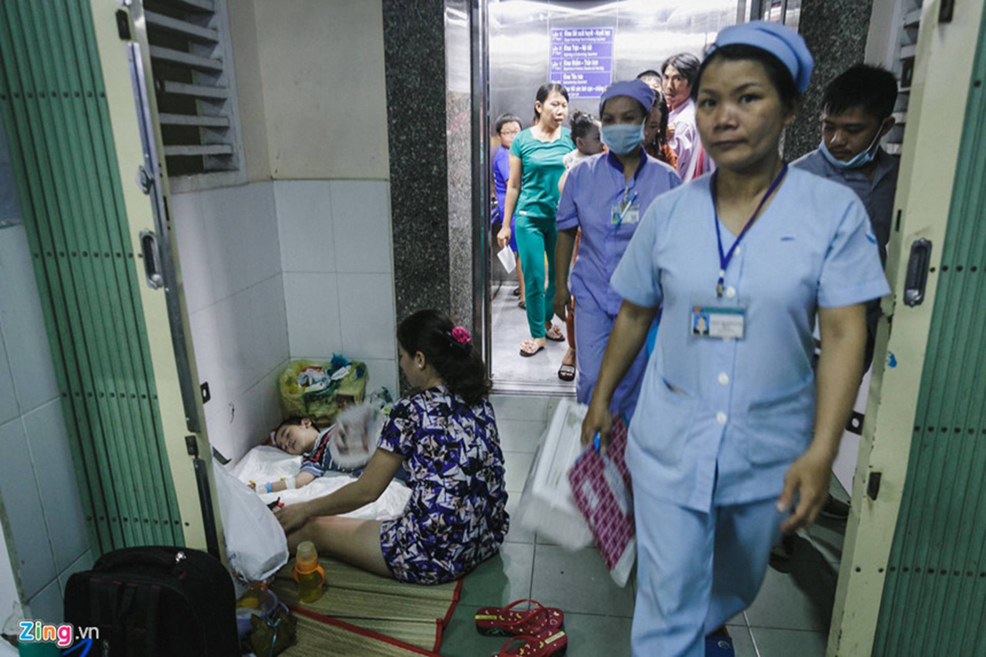 Hành lang, lối ra vào thang máy... tất cả chỗ trống đều được phụ huynh tận dụng để trải chiếu cho bệnh nhi nằm.