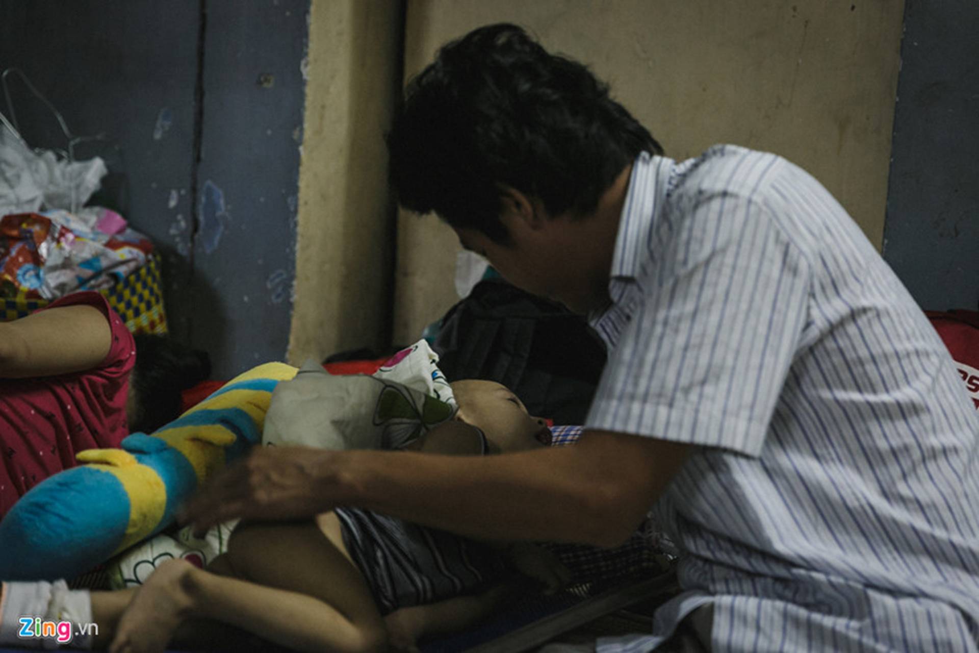 Ở một góc phòng, do lượng bệnh nhân quá đông, hai bệnh nhi được xếp nằm cùng một giường. Một người cha than thở: “Con tôi bị lây tay chân miệng từ một bé khác trong cùng khu nhà trọ ở Cần Thơ. Tháng trước cháu từng bị tay chân miệng, đã được trị khỏi giờ bị lại, bệnh phát nặng hơn nên phải chuyển vào đây. Hai vợ chồng cùng làm công nhân phải bỏ hết việc lên chăm cháu hơn một tuần nay”.