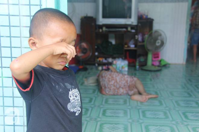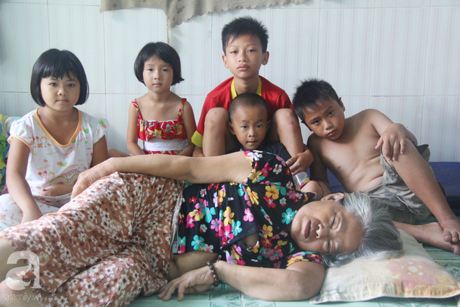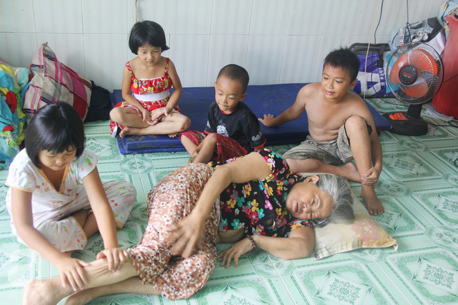 Nằm bệt dưới sàn nhà, bà Dung khẽ gọi đứa cháu gái lớn (Ngọc, 8 tuổi) rót cho bà ngụm nước. Đã vài tháng nay, bà Dung không còn đi đứng được do căn bệnh đau xương sống quái ác khiến bà liệt nửa người, phần mông của bà lở loét khắp nơi vì không có tiền chữa trị.