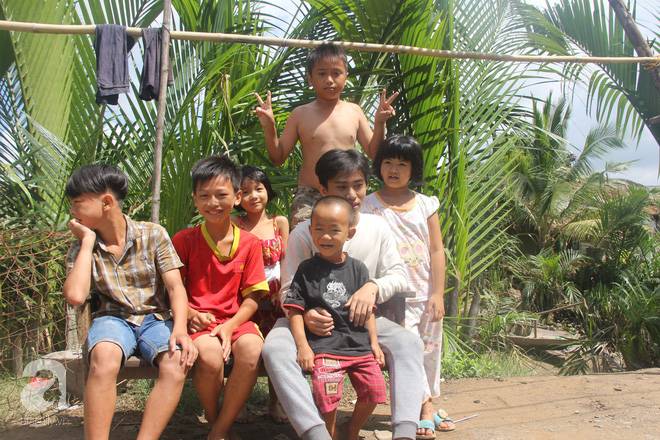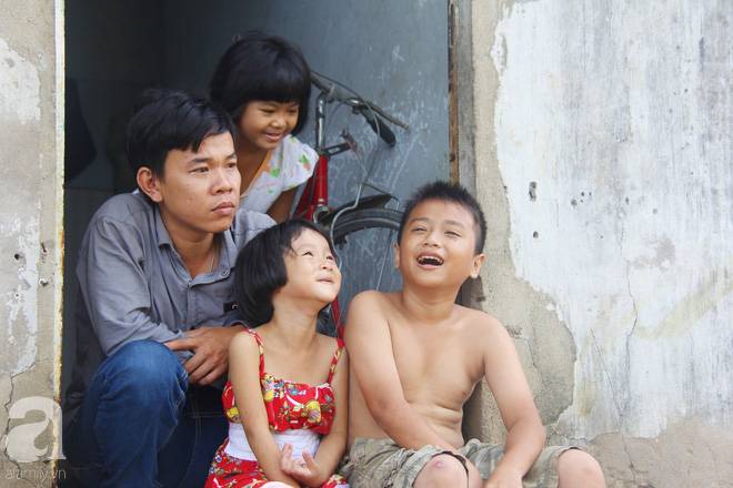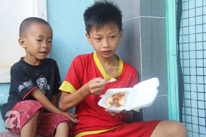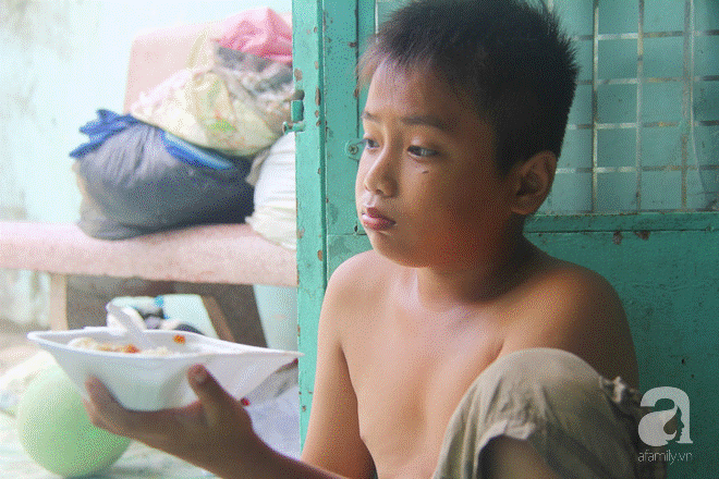 Ngồi chơi cùng mấy đứa trẻ một lúc thì anh Liêm (28 tuổi) cùng Pha (15 tuổi, đứa cháu ngoại lớn) đi làm về. Dáng người nhỏ bé, anh Liêm vội vã dựng chiếc xe máy cà tàng, đưa 4 hộp cơm cho tụi nhỏ rồi đến chỗ bà Dung.