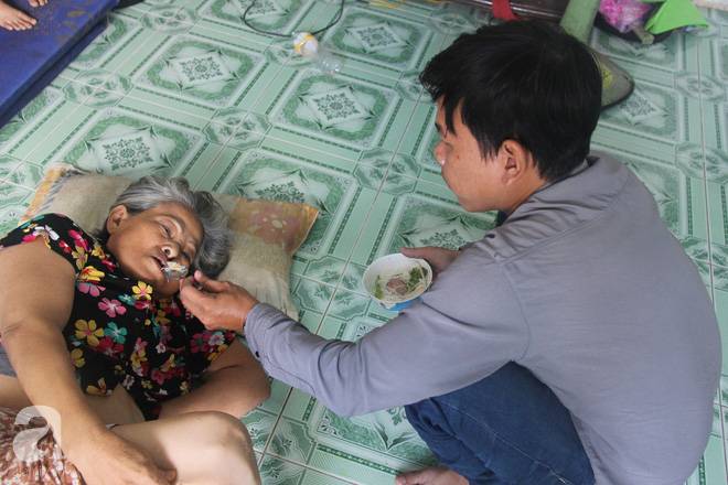 Cố gắng đỡ bà Dung ngồi dậy, đút từng muỗng bún xào, anh Liêm tâm sự: "Cả nhà anh hầu như không ai biết chữ cả, anh cũng không giấy tờ tùy thân nào nên đâu có xin được việc làm. Giờ nhà cửa như vậy, chỉ biết cố gắng sống được ngày nào hay ngày đó thôi. Có tiền thì nấu cơm cho mấy đứa cháu, không thì ăn mì hoặc nhịn đói. Mình khổ trước giờ riết rồi quen. Chỉ sợ mẹ không chịu nổi".