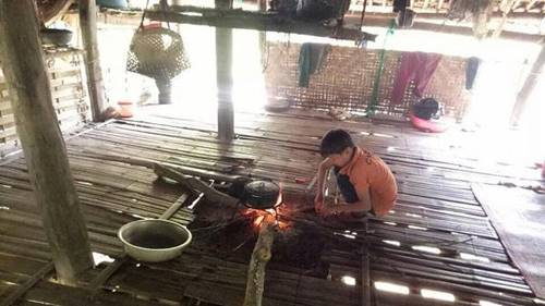 Căn nhà Khuyên đang sống nằm chơi vơi ở sườn núi, được che đậy tạm bằng những tấm lếp thô sơ. Mỗi khi có cơn gió lạnh lùa vào Khuyên lại co rúm người chịu rét. Trong căn nhà sàn cũng chẳng có gì đáng giá, chỉ có manh chiếu nhỏ trải gần bếp lửa để Khuyên ngủ qua đêm, phía góc nhà có vài cái bát và chiếc nồi nhỏ nấu đồ ăn uống qua ngày.