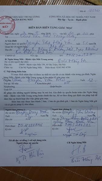 Biên bản hiến giác mạc của gia đình bé Vân Nhi.