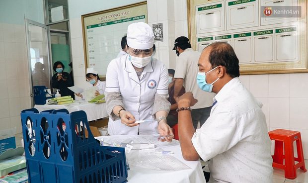 Người dân được khám lại sức khoẻ, đo nhịp tim, huyết áp,... trước khi tiêm vắc xin