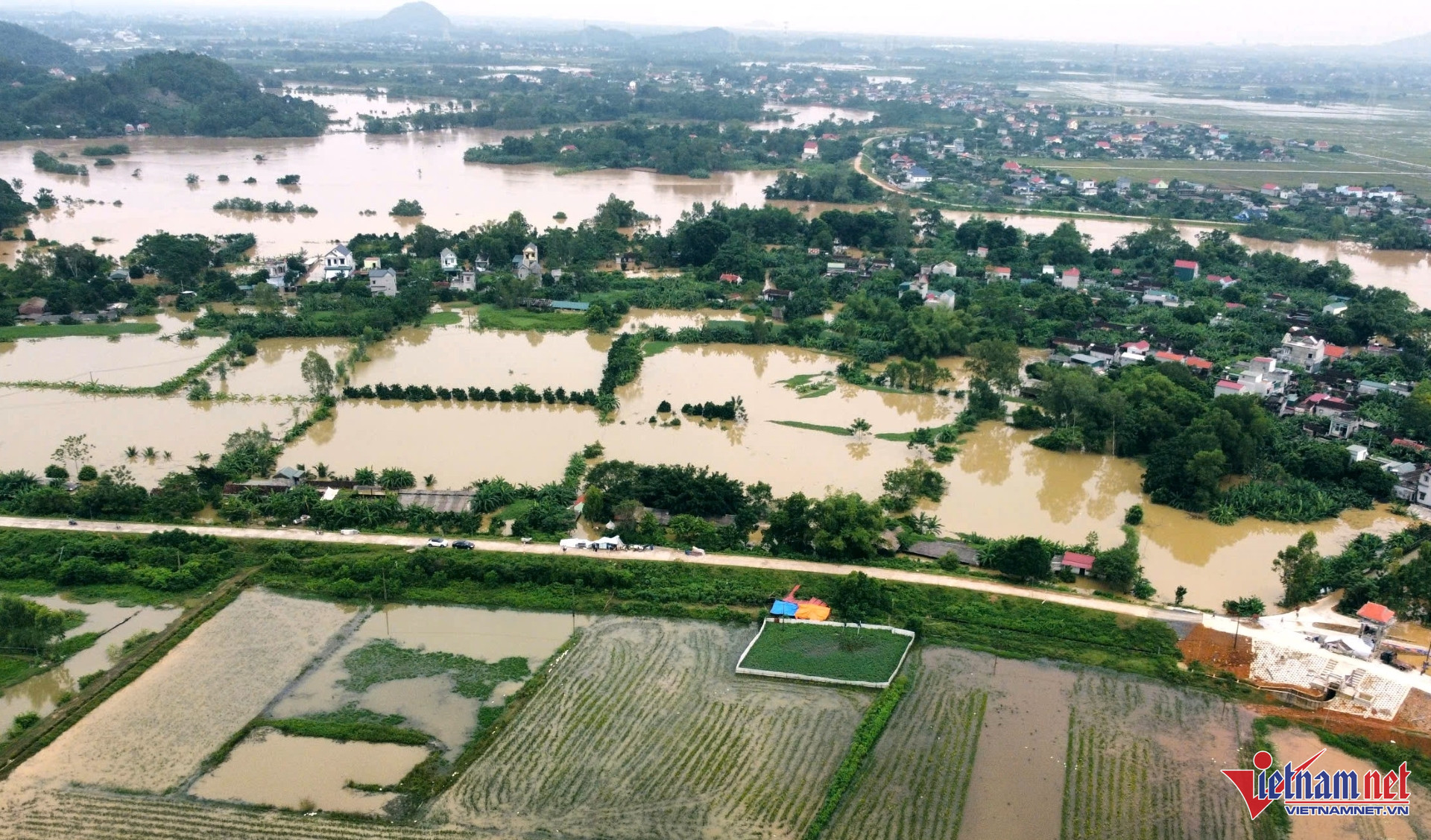 Thôn Chuế Cầu bị nước ngập trắng. Ảnh: Lê Dương