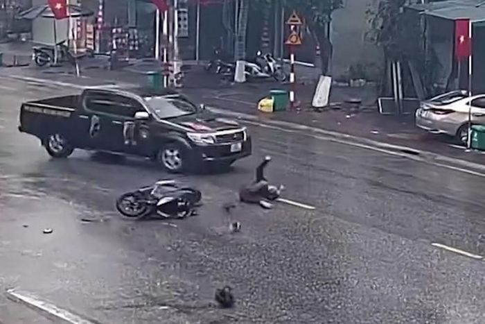 Cú va chạm mạnh, khiến người đi xe máy bị ngã văng ra giữa đường, lăn nhiều vòng... Đúng thời điểm trên, một ô tô bán tải (chưa rõ biển kiểm soát) đi đến đã kịp thời vòng tránh để không cán vào người điều khiển xe máy.
