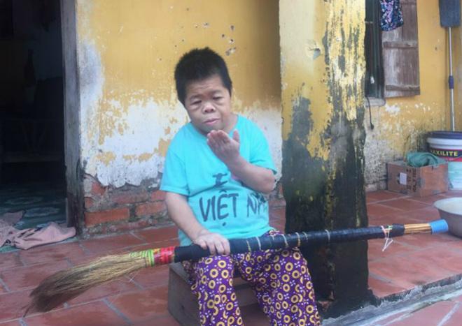 Cô gái "tí hon" đưa đôi bàn tay quệt mồ hôi sau khi quét sân