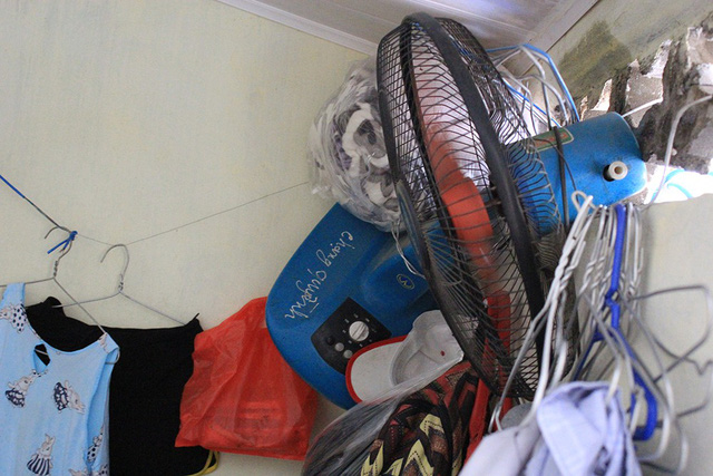Chiếc quạt duy nhất trong phòng trọ của gia đình anh Tha, mà trong hàng năm trời nó trở thành nguồn mát duy nhất cho gia đình anh (Ảnh: Trần Thanh).