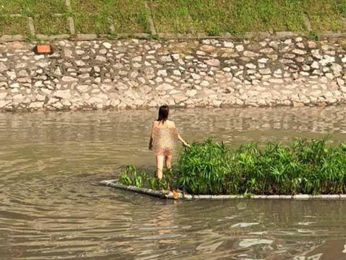Trước đó, mạng xã hội lan truyền những hình ảnh và đoạn clip ghi ảnh một cô gái trẻ mặc quần áo lót đứng giữa sông Tô Lịch (Cầu Giấy, Hà Nội). Theo đó, cô gái thản nhiên đứng trên một bè rau giữa sông rồi nhảy nhót, vẫy tay chào mọi người ở trên bờ.
