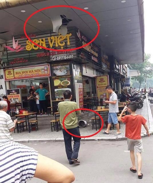 Vào khoảng 10 giờ ngày 20/8, nhiều khách hàng của nhà hàng Sen Việt tại tầng 1, khu chung cư HH Linh Đàm, phường Hoàng Liệt, quận Hoàng Mai (Hà Nội) bỗng giật bắn mình khi nghe tiếng "rầm" từ trên mái tôn. Cả tấm mái che bằng tôn bị thủng một lỗ to và thùng sơn chứa vôi vữa chui tọt xuống. Vữa trong thùng đựng sơn rơi bắn vương vãi dưới nền nhà hàng.