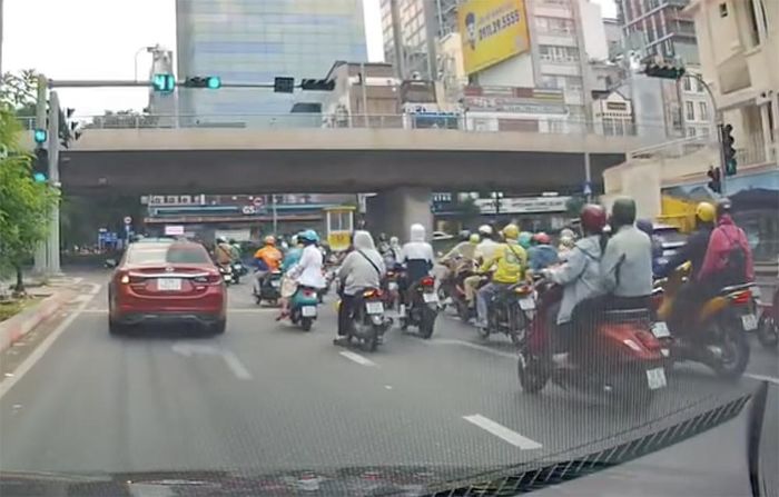 ... bất ngờ chuyển sang đèn vàng rồi đỏ, khiến dòng người đang điều khiển phương tiện lưu thông không kịp xử lý. Ảnh: Cắt từ clip