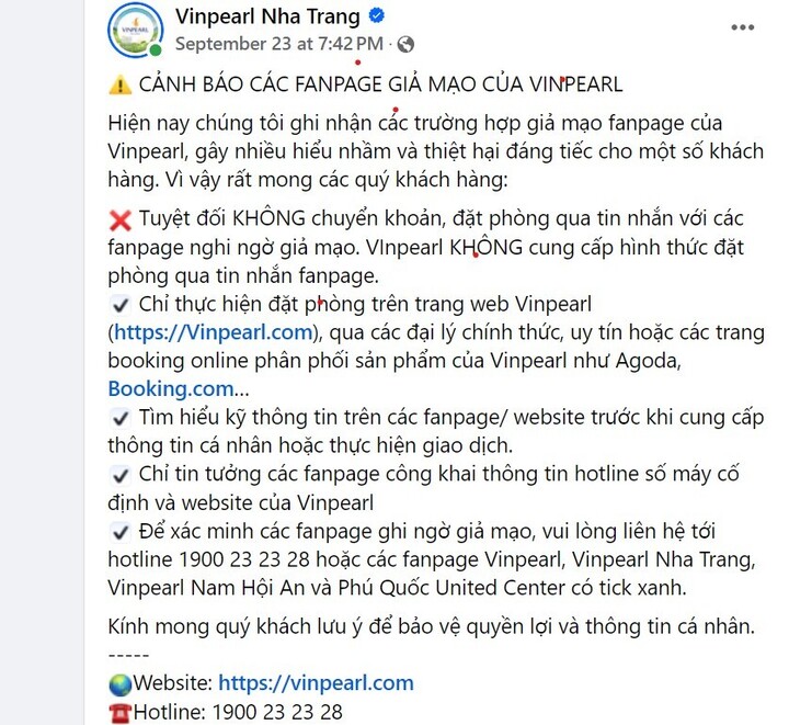 Ngày 29/9, bà Nguyễn Thị Lệ Thanh - Giám đốc Sở Du lịch tỉnh Khánh Hòa cho biết, đơn vị đã gửi văn bản đến các đơn vị du lịch địa phương yêu cầu nâng cao cảnh giác trước tình trạng nhiều khách sạn 4-5 sao tại TP Nha Trang bị lập trang fanpage giả mạo, lừa đảo chiếm đoạt tiền cọc phòng của khách.