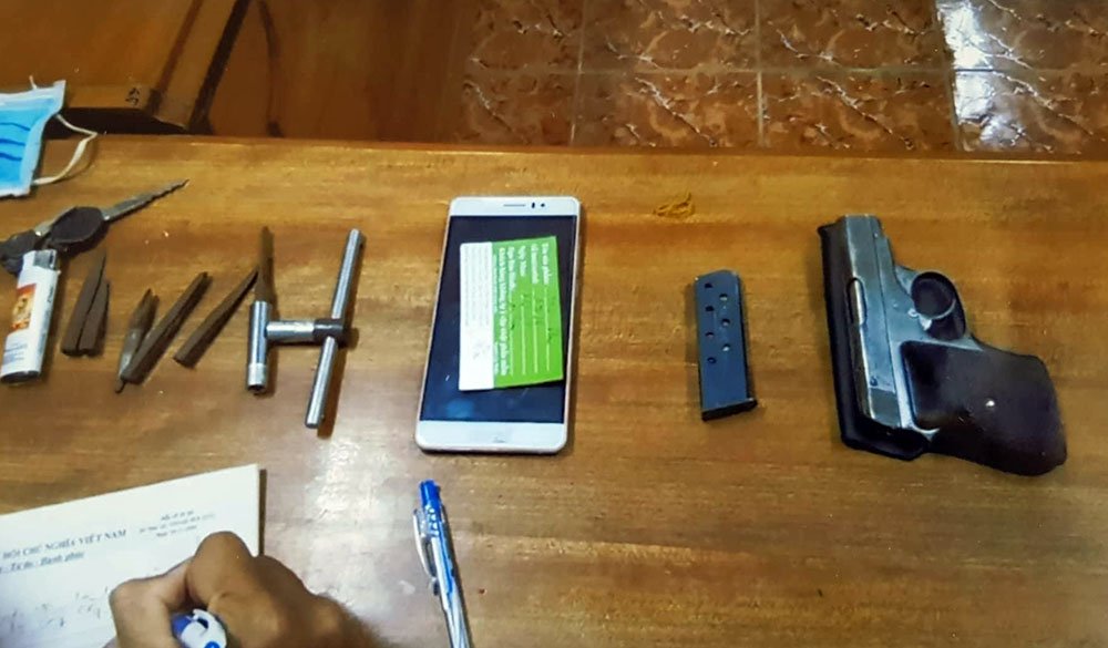 Tang vật công an thu giữ trên người Phong "sói", trong đó có khẩu súng hắn dự định dùng giết người hàng loạt khi sang Campuchia