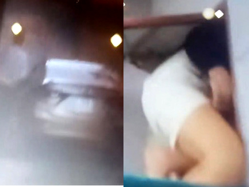 Ông Thuân giải thích bà Minh bị trúng gió, đau bụng nên phải thuê phòng nghỉ, nhưng video clip lại ghi hình bà Minh ngồi trên mái nhà sau ô cửa thông gió, trong lúc nhiều người đập cửa phòng gọi mở (ảnh cắt từ clip)