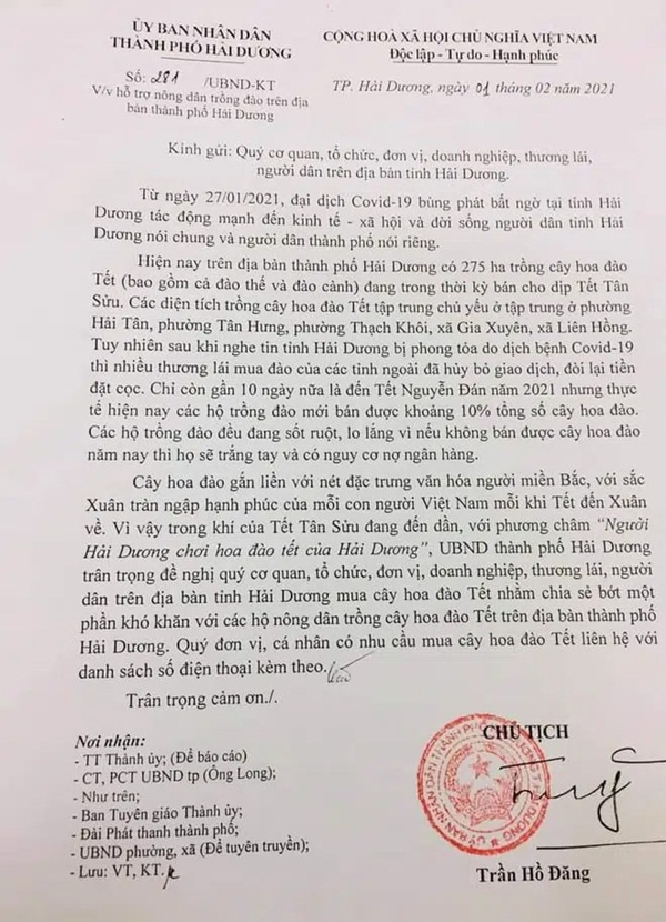 UBND thành phố Hải Dương mong muốn quý cơ quan, tổ chức, đơn vị, doanh nghiệp, thương lái, người dân Hải Dương mua cây hoa đào Tết nhằm chia sẻ bớt một phần khó khăn với các hộ nông dân trồng cây hoa đào Tết trên địa bàn thành phố Hải Dương.