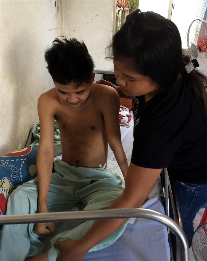 Chúng tôi đến tận giường bệnh. Người bệnh là Kim Giang (18 tuổi, dân tộc Khmer) ngụ tại huyện Tiểu Cần, Trà Vinh. Giang nằm ngửa. Hai bàn tay đan vào nhau với những cử động liên tục.