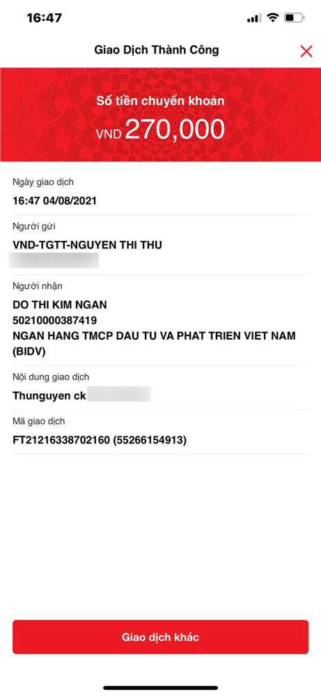 Chị Thu 2 lần chuyển khoản với tổng giá trị 16.870.000 đồng