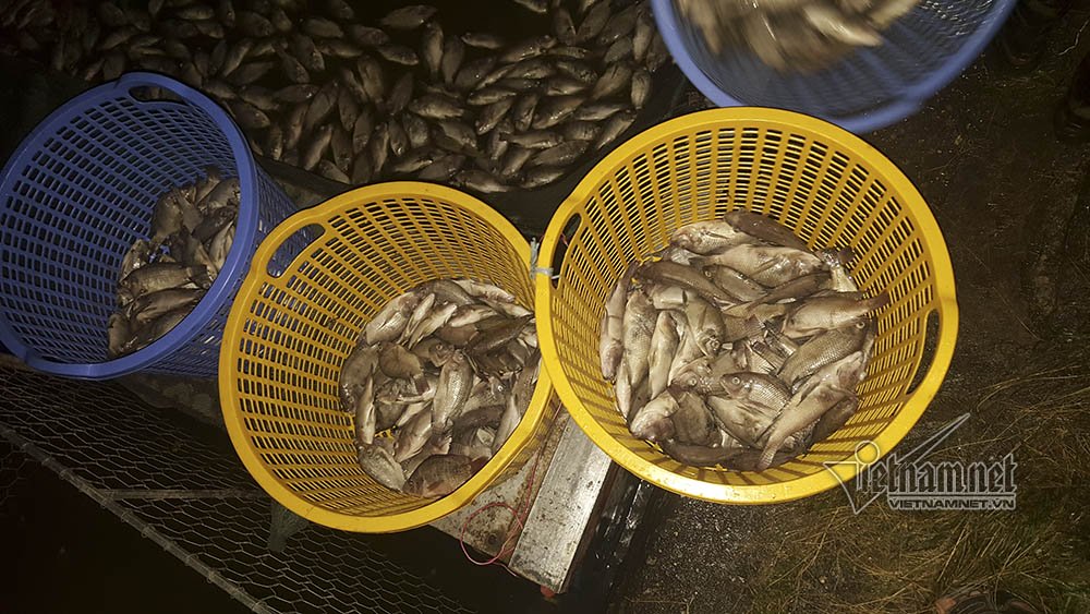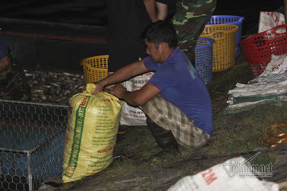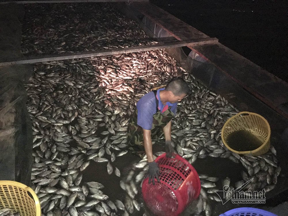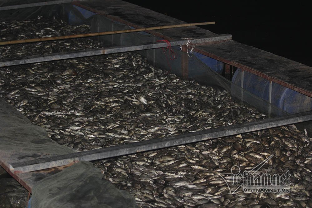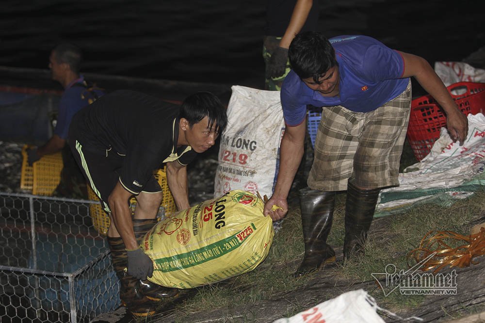 Công việc vớt, dọn cá kéo dài đến rạng sáng nay mới xong. Cá chết chủ yếu là rô phi, mè nặng khoảng nửa cân mỗi con. Xác cá được gom dày đặc trong chiếc lồng rộng khoảng 30 m3. Khoảng 100 bao các loại được dùng để đựng số cá chết, trước khi được tập kết vào xe mang đi xử lý.