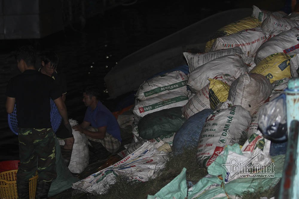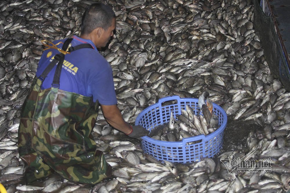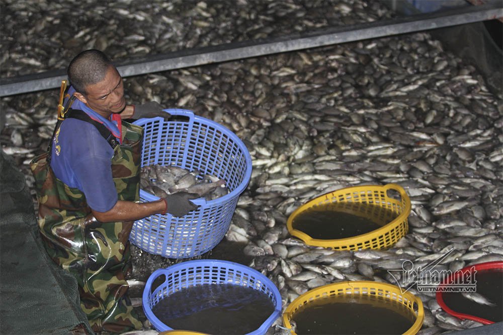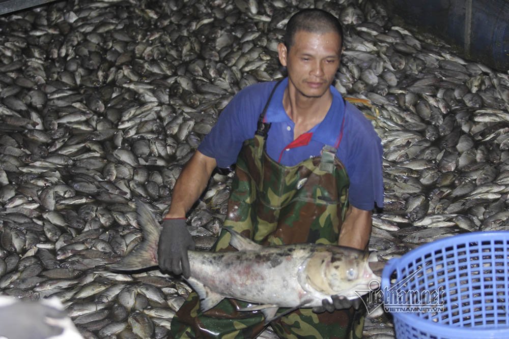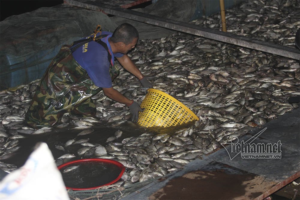 Công việc vớt, dọn cá kéo dài đến rạng sáng nay mới xong. Cá chết chủ yếu là rô phi, mè nặng khoảng nửa cân mỗi con. Xác cá được gom dày đặc trong chiếc lồng rộng khoảng 30 m3. Khoảng 100 bao các loại được dùng để đựng số cá chết, trước khi được tập kết vào xe mang đi xử lý.