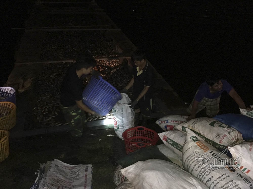 Thu gom xuyên đêm, 4 người đã đóng được gần 100 bao cá chết