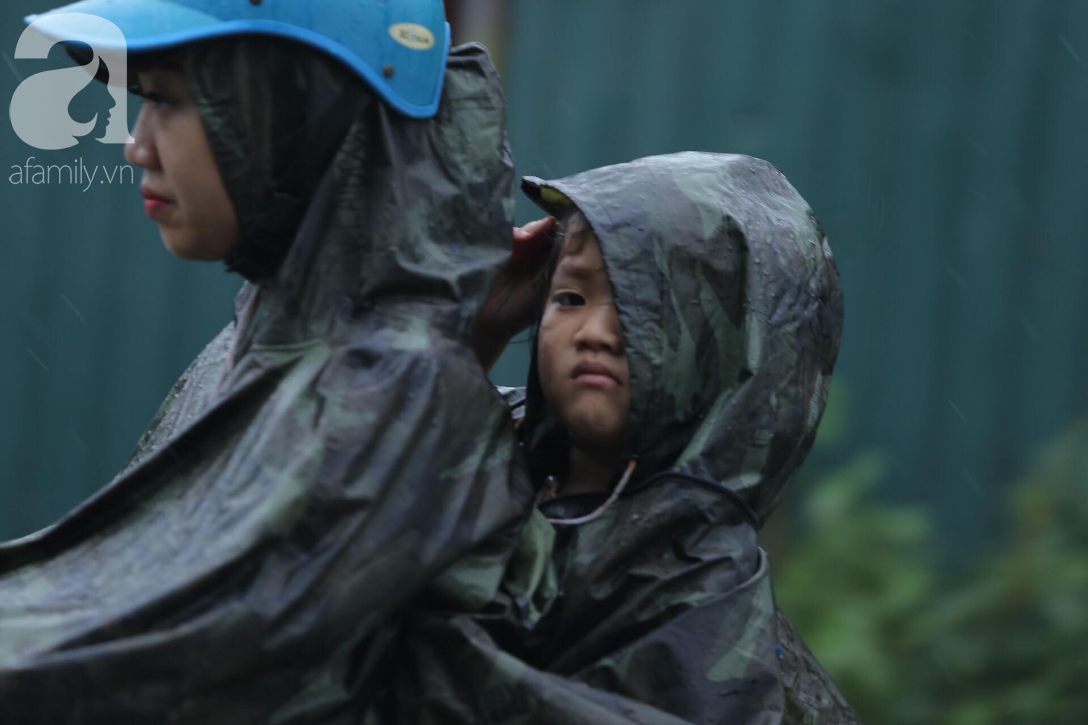 Một em bé được mẹ che chắn kĩ trong cơn mưa tầm tã.