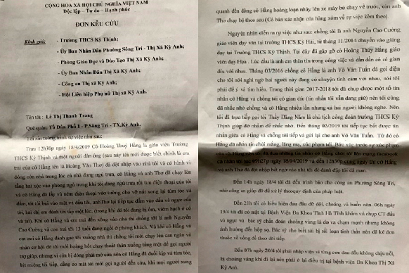 Chị Tr. đã viết đơn tố cáo gửi công an. Trong đơn, chị cho biết, từ 2016 đến nay đã lưu giữ tin nhắn thân mật giữa chồng mình và cô giáo H. Cả hai người này đang công tác tại Trường THCS Kỳ Thịnh.