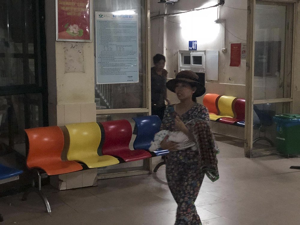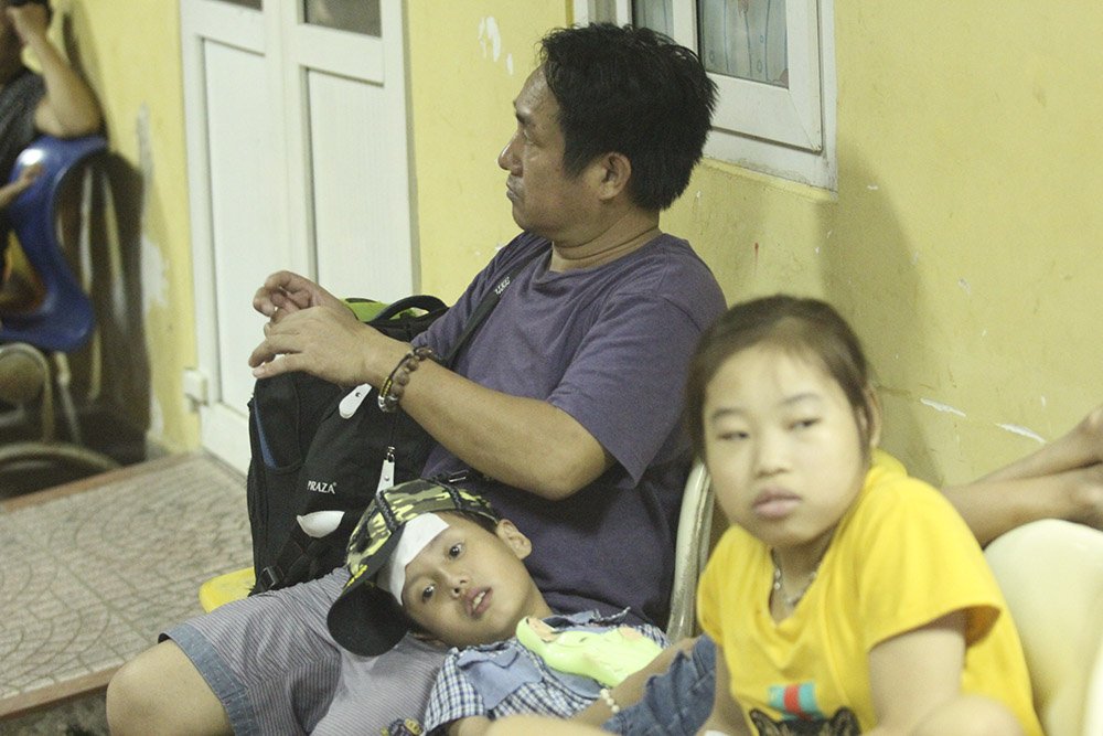 Bố mẹ bồng con, xách đồ đạc ra khỏi khu khám bệnh