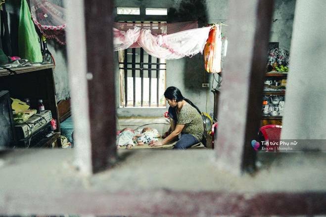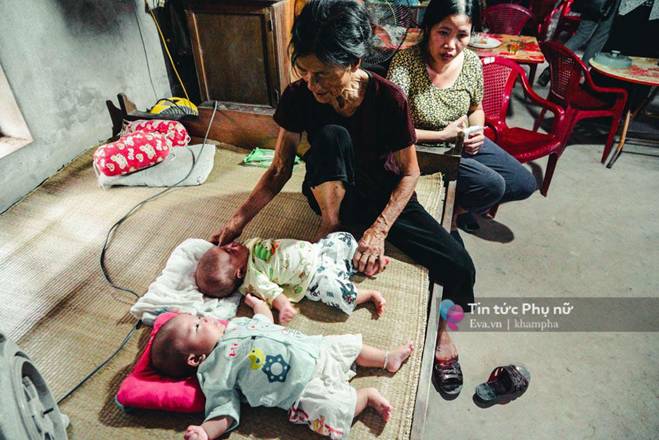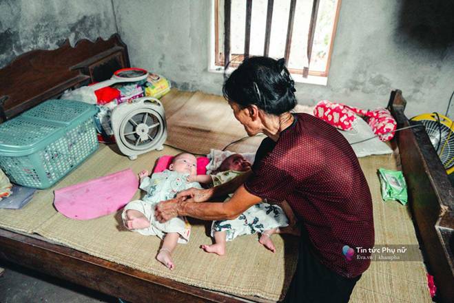 Bà 73 tuổi, gầy gò, lưng còng, chân chậm, tay yếu không chỉ lo chăm sóc 2 cháu sinh đôi mới 4 tháng 10 ngày mà còn lo việc lợn gà, vườn tược, cơm nước và cả việc tắm giặt của chị mỗi ngày.