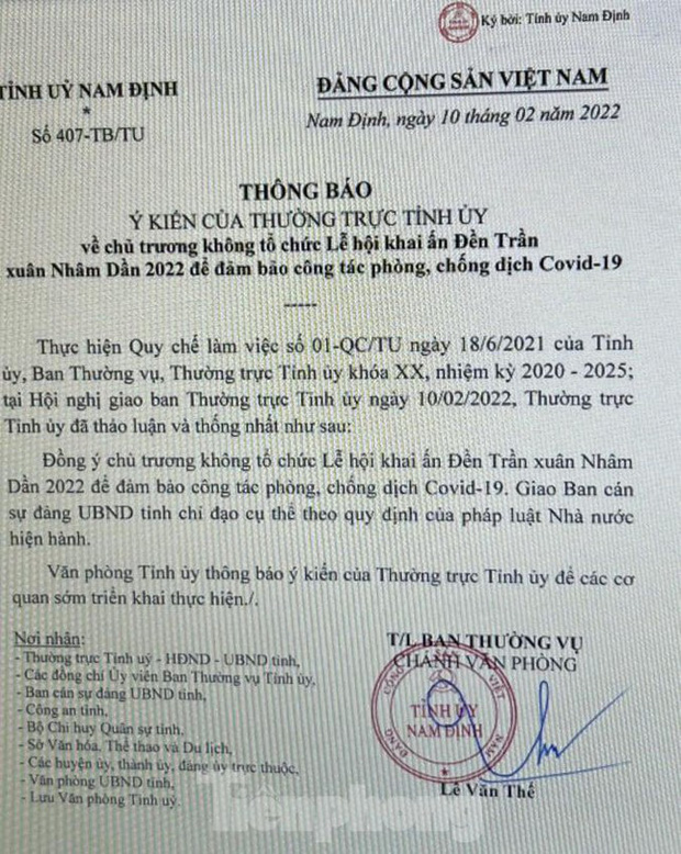 Chiều ngày 11/2, ông Trần Anh Dũng, Phó Chủ tịch thường trực UBND tỉnh Nam Định cho biết, Thường trực Tỉnh uỷ Nam Định vừa ban hành Thông báo số 407/TB-TU thông báo về việc không tổ chức Lễ hội khai ấn đền Trần xuân Nhâm Dần 2022 để đảm bảo công tác phòng chống dịch.