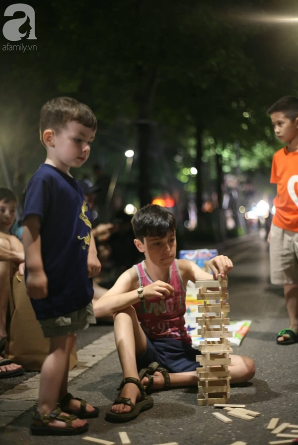 Các em nhỏ Việt và nước ngoài hào hứng với các trò chơi dân gian ở phố đi bộ Hồ Gươm.