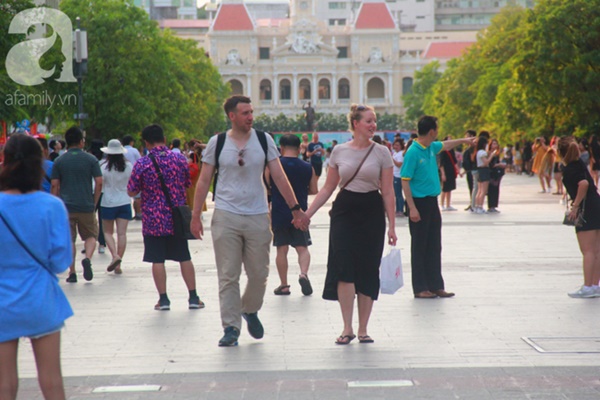 Các du khách nước ngoài cũng tới phố đi bộ để dạo mát, chờ đón pháo hoa.