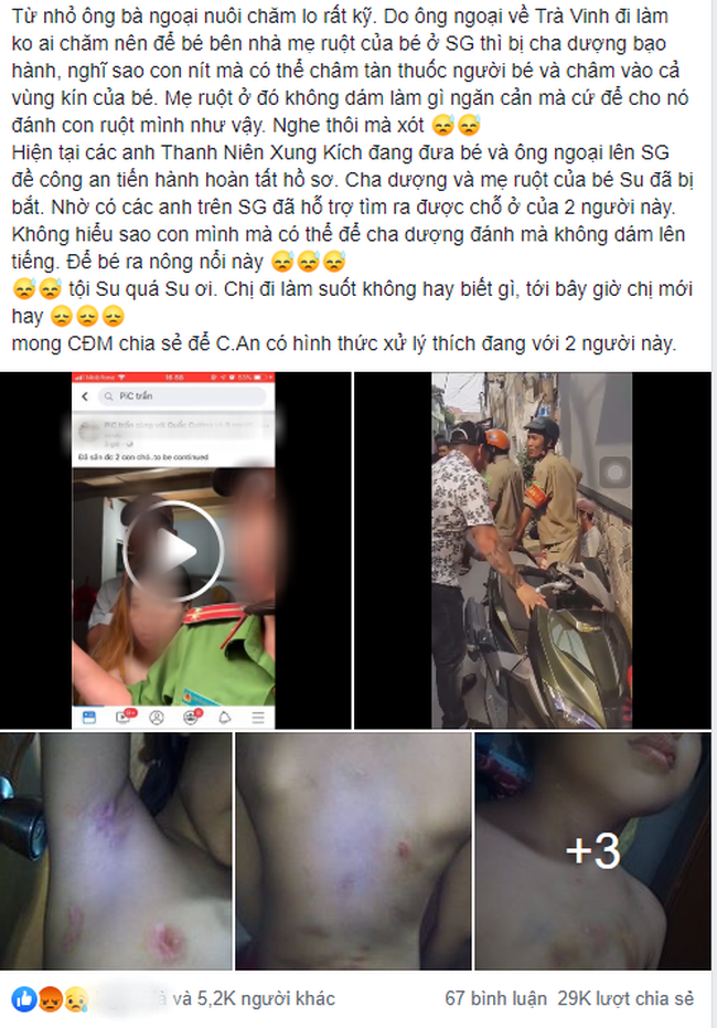 Đính kèm với bài viết là hình ảnh của một bé gái trên người toàn những vết sẹo nghi do bị cha ruột bạo hành, châm tàn thuốc vào người. Đồng thời là đoạn clip ghi lại cảnh lực lượng chức năng đang dẫn giải người phụ nữ (được cho là mẹ bé gái) và người cha dượng lên cơ quan điều tra. Sự việc diễn ra trước sự chứng kiến rất đông người hiếu kì.