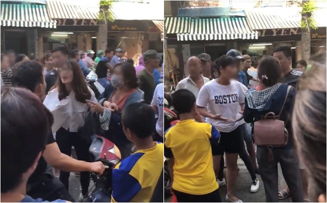 Rất đông người dân đã tập trung theo dõi và can ngăn sự việc. 1 người phụ nữ đứng giữa, nói với cô gái áo xanh: "Không biết nó làm gì nhưng mình đánh nó là mình sai đấy".