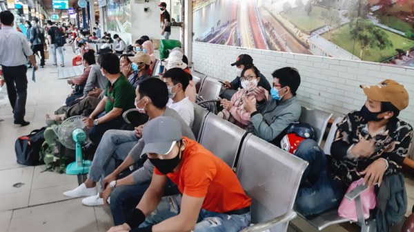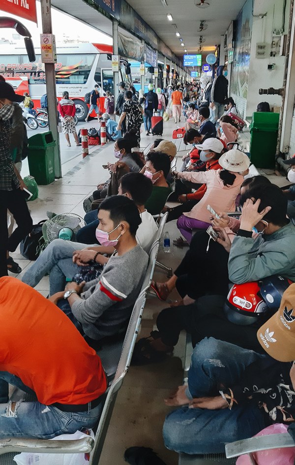 Những bạn trẻ chờ đợi tại bãi xe của bến xe Miền Đông chuẩn bị rời thành phố trước giờ áp dụng biện pháp hạn chế di chuyển, tụ tập đông người.