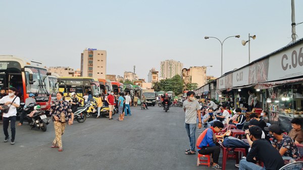 Khu vực trước bãi đậu xe rất đông khách ngồi chờ chuẩn bị lên xe. Tuy nhiên việc tập trung đông người nơi công cộng này tiềm ẩn nguy cơ dịch lan rộng.