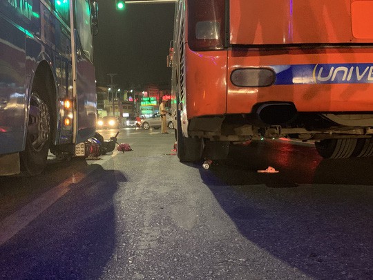 Chiếc xe khách màu xanh cán xe máy chở 2 mẹ con. Đứa con văng ra, đúng lúc xe khách màu đỏ vượt lên cán ngang người