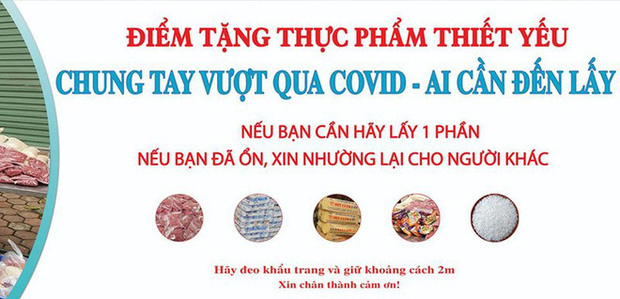 Tại các điểm phát hàng từ thiện đều có thông điệp "Ai cần đến lấy. Nếu bạn cần hãy lấy 1 phần. Nếu bạn đã ổn, xin nhường lại cho người khác".