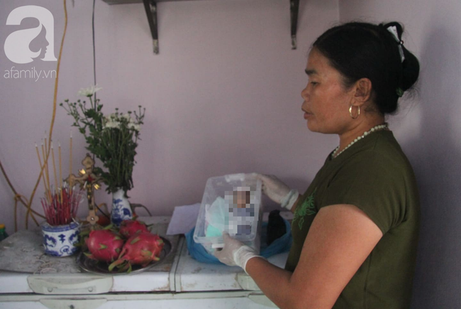 Chị Cúc đang mở hộp đựng thai nhi, chị nâng niu như những đứa con của mình