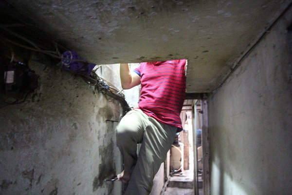 Nơi ở của ông Xuân nằm sâu trong ngõ 44 Hàng Buồm. Dẫn chúng tôi lên thăm nhà, người đàn ông này phải bật đèn điện thoại soi mới thấy đường đi. Con ngõ nhỏ đến mức hai người đi bộ ngược chiều sẽ không thể lách được. Đến giữa con ngõ, ông Xuân vừa nói, vừa dặn dò: “Nhà tôi ở trên này, phải leo qua những thanh sắt chữ U tự chế, lên phòng đừng buông chân xuống dưới kẻo chạm vào đầu người khác”.