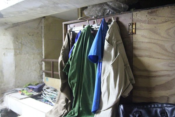 Xung quanh tường nhà được ông Xuân dán đủ các lớp giấy chống ẩm và nấm mốc. Quần áo cũng được ông treo áp sát vào tường để đỡ tốn diện tích. “Quần áo tôi giặt ở dưới sân tập thể rồi phơi nhờ. Ngoài vấn đề nóng bức, bí khí, không sóng điện thoại,... vấn đề khổ nhất là mỗi khi thay quần áo.