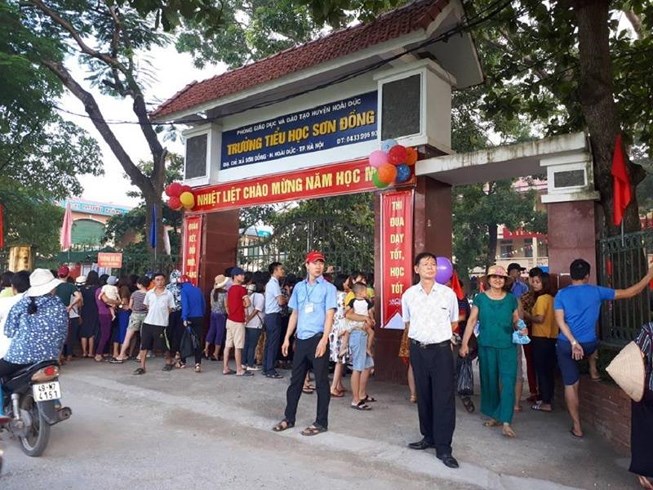 Phụ huynh tập trung trước cổng Trường Tiểu học Sơn Đồng sáng 5-9.