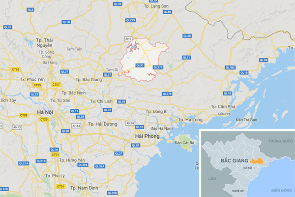 Vị trí huyện Lục Ngạn (vùng khoanh đỏ). Ảnh: Google Maps.