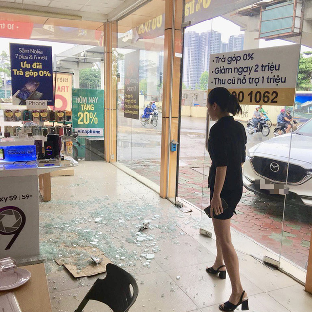 Theo đó, vào khoảng 9h30 sáng 27/07, nhiều nhân viên tại cửa hàng Thế giới di động tại số 111 Hồ Tùng Mậu, Cầu Giấy không khỏi giật mình hoảng hốt. Chiếc cửa chính của cửa hàng làm bằng kính bỗng vỡ tan tành do một chiếc ô tô màu trắng từ ngoài đường lao vào.