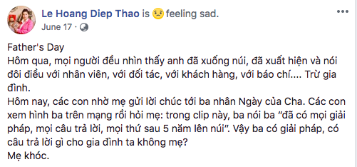 Liền sau đó, vào cuối tháng 3, bà Thảo xuất hiện trên truyền thông, chia sẻ về câu chuyện ngôn tình nhưng kết thúc không như mơ giữa 2 vợ chồng, đồng thời đưa ra thông tin hết sức bất ngờ: ông Đặng Lê Nguyên Vũ không còn bình thường sau khóa thiền nhịn ăn 49 ngày. Xen giữa câu chuyện là hình ảnh những đứa con luôn mong mỏi người cha trở về.