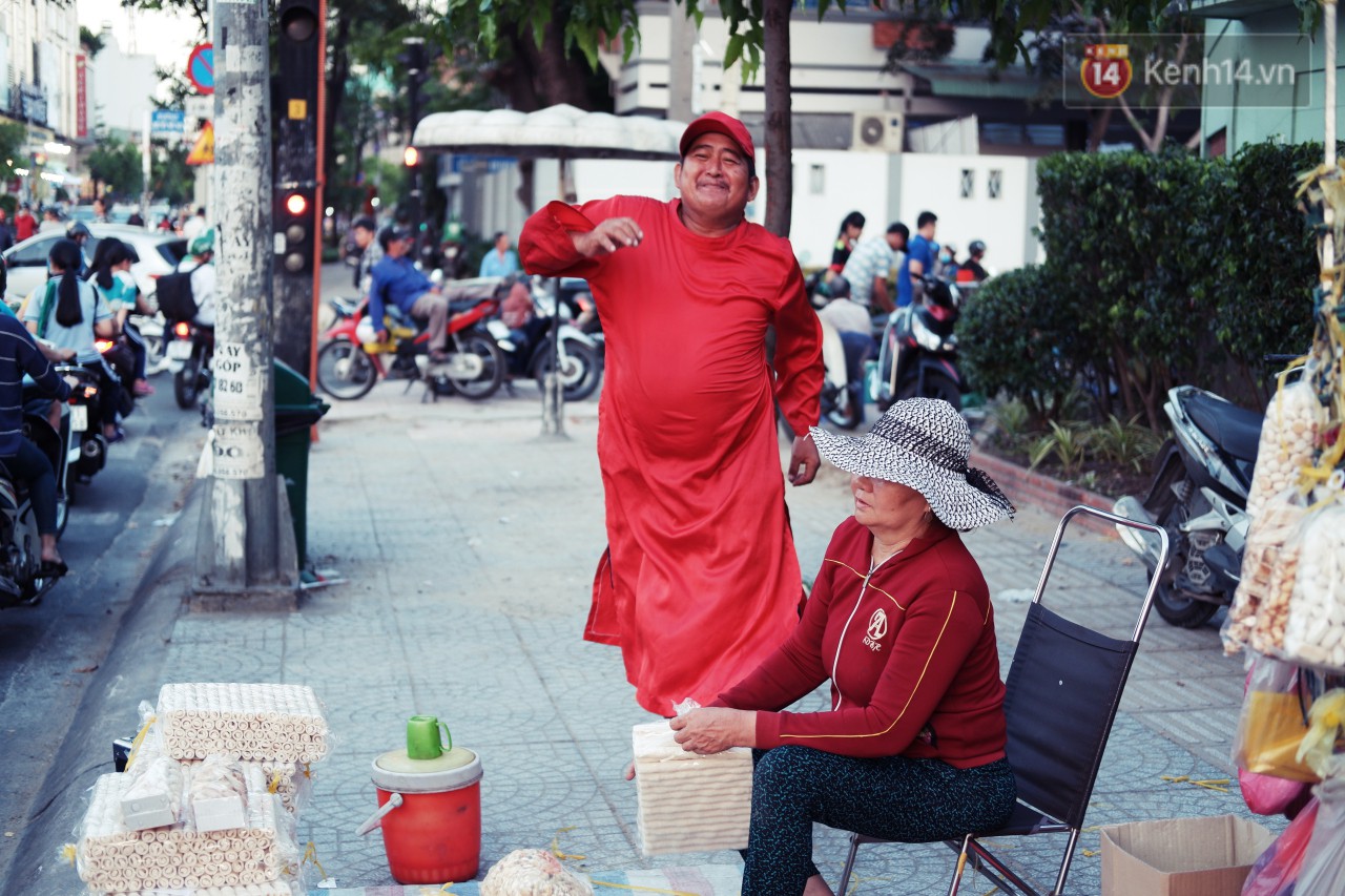Dưới cái nắng buổi trưa như thiêu đốt của Sài Gòn, người đàn ông trong chiếc áo dài đỏ vẫn tươi cười nhảy múa trên đường phố, ông không quên cúi đầu chào những người qua đường và cảm ơn ai đó đã ghé lại gánh hàng để mua 1 bịch bánh.