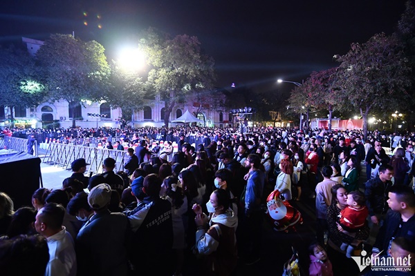 Người dân tập trung ở gần ngã ba Hàng Trống - Lê Thái Tổ đón xem chương trình văn nghệ được tổ chức ở ngoài trời.