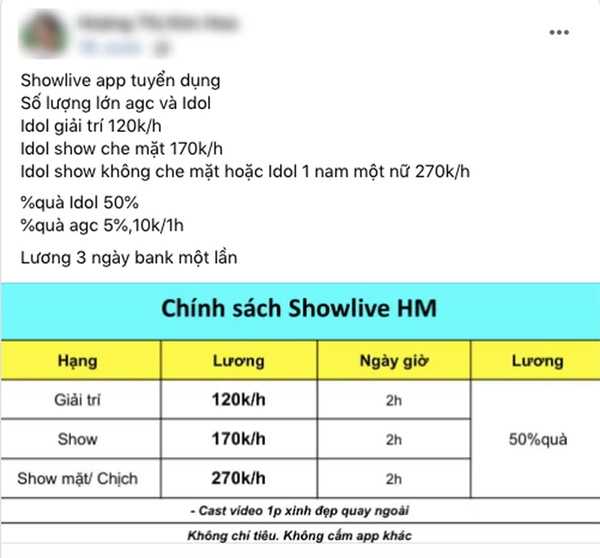 Trên một số hội nhóm mạng xã hội, các tài khoản liên tục đăng bài tuyển dụng idol tham gia livestream trên ứng dụng với mức lương hấp dẫn kèm theo quà tặng. Theo đó, nếu như các cô gái livestream lộ mặt sẽ được trả 270k/h, nếu che mặt mức phí chỉ còn 170k/h. Thậm chí, một số tài khoản còn công khai đăng tuyển 1 nam 1 nữ tham gia App không chỉ quay những hình ảnh gợi cảm mà có thể quay cảnh táo bạo, quan hệ tình dục trực tiếp nếu sẵn sàng.